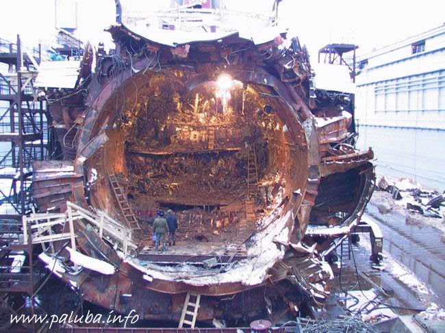 U isto vreme se oglašava signal klaksonom na podmornici. Jedno od njihovih bojevih torpeda, pogonjenih tečnim gorivom, propušta. Neispravno torpedo se ukrcava u torpednu cev i komandant podmornice traži dozvolu od štaba Severne flote da izvrši prinudno lansiranje neispravnog torpeda. U 1128 sa Petra Velikog je lansirana poslednja raketa. Komandant Petra Velikog, Ovčarenko, posmatra ulazak rakete u vodu kada se začula podvodna eksplozija, tačno u 1128,27 časova.